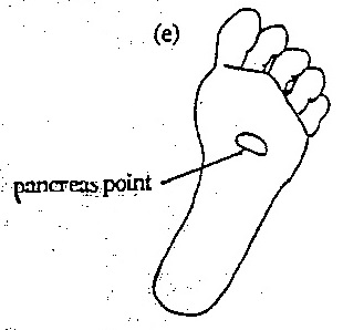 Other techniques that help this condition are beak breath (the mouth is pursed in a tight 'O' like a beak and the breath inhaled either in one long stroke or in short sips) for 31 minutes (c), maha mudra for 15 minutes (d), and foot massage at the pancreas point (e).